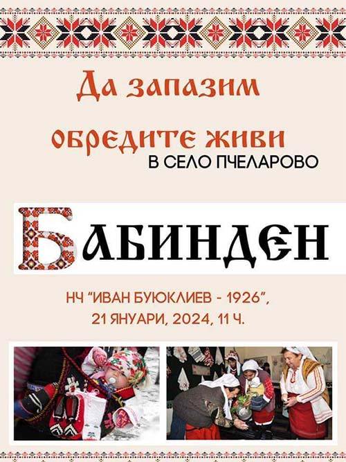 Будни жителки на Пчеларово, водени от председателката на Читалище „Иван Буюклиев 1926“ Ваня Михалева, отново готвят празник за своите съселяни. И този път той ще протече под мотото «Да запазим традициите». На 21 януари от 11 часа самодейци ще покажат местен ритуал, свързан с Бабинден: как се е бабувало в Пчеларово, как са ходили при главната баба и са показвали уважението си към нея.