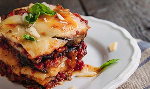 Добавят се още няколко лъжици от доматеният сос и отново се слагат патладжан и моцарела и по този начин се нарежда цялото ястие, като накрая завършва с доматен сос, пармезан и моцарела. Покрива се с алуминиево фолио и се пече за 20 минути. След това фолиото се маха ястието се запича за още 20 минути до апетитен златист загар, пише 1001recepti.com.