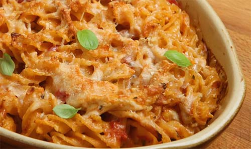 Междувременно сварявате пастата (фусилите са много подходящи за тази рецепта), според инструкциите на опаковката. След като е сварена, добавяте пастата към соса, заедно с 1-2 черпака от водата, в която е вряла и разбърквате, така че сосът да се разпредели равномерно и да овкуси пастата. Изсипвате пастата с пиле и доматен сос в тава, поръсвате с настърганата моцарела и запичате в предварително загрята на 170 градуса фурна за около 5-10 минути до получаване лек апетитен златист цвят, пише supichka.com.