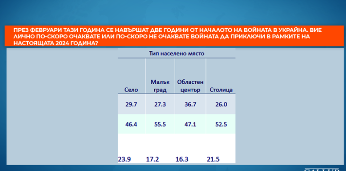 „Галъп“: Половината българи не очакват войната в Украйна да приключи през 2024 г. Демографският разрез показва, че при най-младите очаквано мненията се формират по-трудно. Същото важи и като цяло за групите с по-ниско образование и достъп до информация