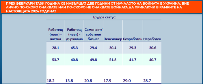 Две години след пълномащабната руска инвазия в Украйна 30,7% очакват войната да приключи до края на годината, но 49,9% не очакват край. Останалите се колебаят.