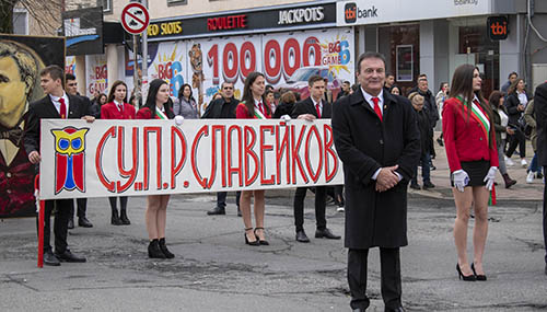 Славейковци отново бяха най-многобройната представителна група в шествието за националния празник в Кърджали. Водени от знаменната група, малките мажоретки, младежите от танцов състав “Родопея”, фирмата на училището и портрета на Петко Рачов Славейков, блок национални знамена и лично от директора Милко Багдасаров, малки и големи възпитаници на най-голямото кърджалийско училище формираха внушителна колона като завършек на общоградското шествие.