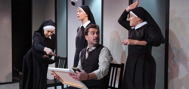 Режисьор на спектакъла е Николай Младенов. В постановката участват Йорданка Стефанова, Ана Вълчанова, Албена Павлова, Полин Лалова, Мартин Каров, Боян Арсов. Действието се развива около 4 монахини, заподозрени за загадъчното убийство на сестра Катрин Уелстоун. Те са обект на разследване от инспектор Джеферсън и неговият помощник сержант Боб. С напредването на нощта нещата се заплитат все повече и мистериозното убийство става все по–загадъчно. „Светици и перверзници“ е една иронична, „свята“ и пикантна криминална комедия, където дори и смъртта отстъпва място на смеха.