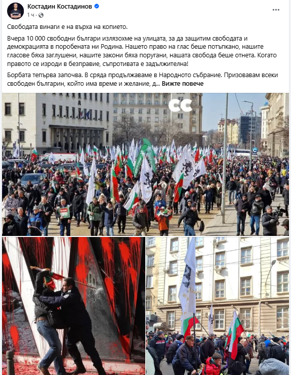 Първият коментар, който направи Костадинов след протеста вчера, беше в социалната мрежа Фейсбук.