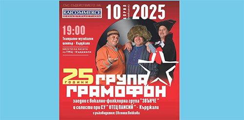 Заповядайте на 10.04.2025 г. от 19:00 часа в Театрално – музикален център – Кърджали! 25 години група “ Грамофон“ , заедно с вокално -фолклорна група “ Звънче “ при СУ Отец Паисий с художествен ръководител Evgenia Peikova ще ни подарят една емоционална вечер! И нека бъде музика!