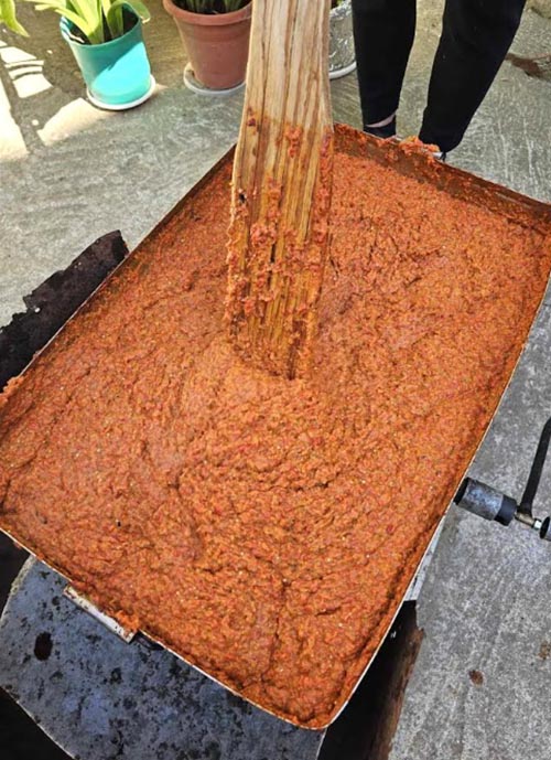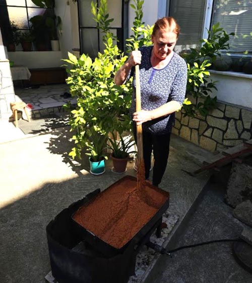 Всяка есен Софка Карамфилова от Ардино приготвя традиционна едросмляна лютеница, която носи вкуса на истински домашни продукти. Всички зеленчуци – чушки, домати, моркови, чесън и магданоз – са лично отгледани в нейната градина.
