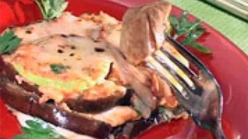 В грил тигана, в който е било месото, се загрява малко олио и патладжаните се запичат от двете страни. След това се подреждат в тавата върху пилешкото месо.