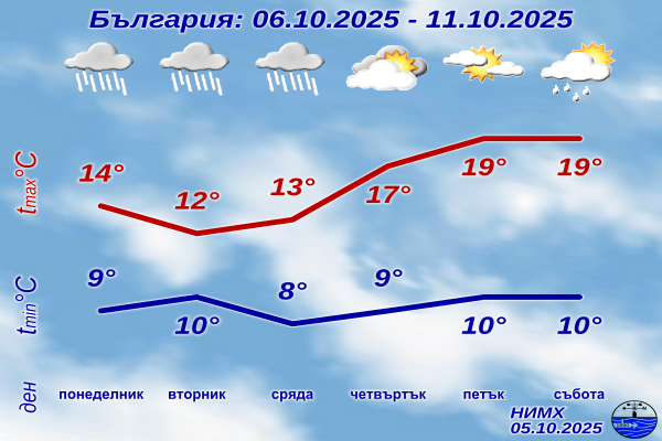 През първите дни от новата седмица ще бъде облачно с валежи. Повишава се вероятността в много райони да са временно интензивни и значителни по количество, в понеделник главно в югоизточната половина от страната, а във вторник и сряда в Северна и Източна България. Вятърът ще е от северозапад, до умерен. Сутрешните температури ще се повишат и минималните ще бъдат между 6° и 11°, а максималните – предимно между 10° и 15°, в понеделник в източните райони до 18°-20°.