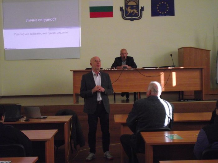 Участниците в дискусията преминаха през обучение за прилагане на индивидуални и колективни мерки (средства) за защита на населението при кризисни ситуации, причинени от природни бедствия . Бе представена и презентация на тема „Превантивни мерки, поведение и действия при пожари”.