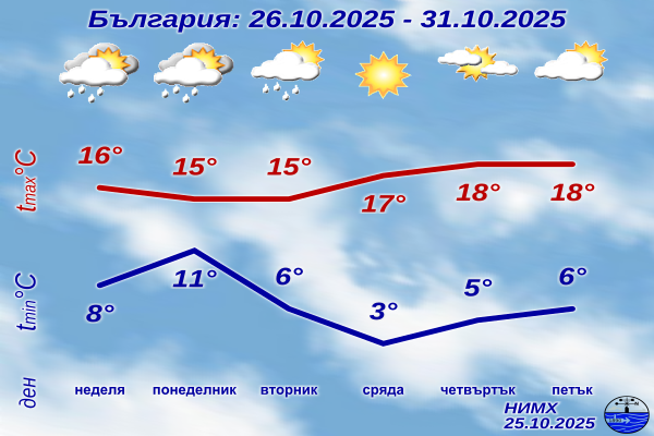 През следващите дни ще бъде предимно слъчево. Сутрин ще е студено, на места в котловините минималните температури ще са близки до нулата и ще има условия за слана, а в равнинната част от страната видимостта ще е намалена. В сряда ще остане хладно с максимални температури в по-голямата част от страната до 15°, а в четвъртък и петък ще се затопли.
