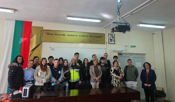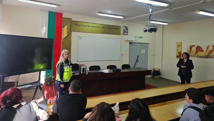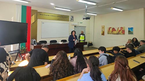 Полицейският инспектор Вили Бонина продължи наболялата напоследък тема за пътните инциденти, като изложи пред ученици данни за страшната статистика в страната ни напоследък за изключително тежките пътно-транспортни престъпления, множество на брой и все по-често с участници млади хора. Тя акцентира, че е изключително важно вниманието и концентрацията на пътя, като им маркира основните причини, които водят до нарушение на концентрацията при управление МПС, след което насочи вниманието им към управлението на такова след употреба на алкохол и наркотични вещества. За да добият по-ясна представа практически за темата, на учениците бяха показани какво представляват т.нар. “Дрегер“ – техническото средство за измерване на алкохол в кръвта, както и „Дръг Тест“-система за установяване на употреба на наркотични вещества. „Не си и помисляйте да употребите алкохол или наркотично вещество и да се качите да шофирате!“, апелира към младежите инспектор Бонина.