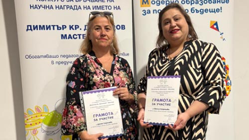 Донка Георгиева – директор на Детска градина „Митко Палаузов“ в Крумовград и Светла Кайрякова – психолог в детската градина участваха в конкурс на издателство „Клет България“ посветен на големия български педагог Димитър Димитров – Мастера.