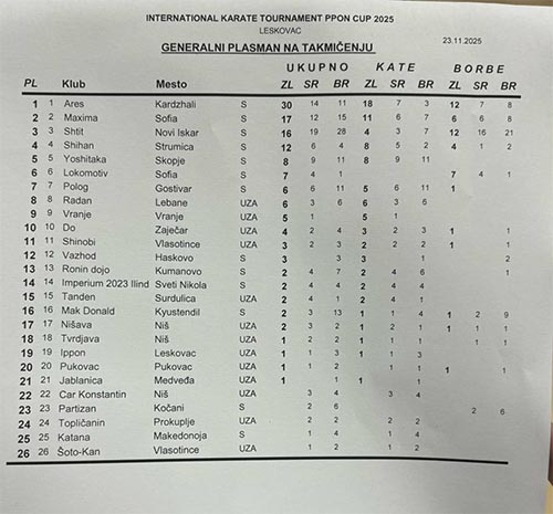 През изминалия уикенд Карате клуб „Арес“ – Кърджали участва в традиционния карате турнир IPPON CUP 2025 в сръбския град Лесковац. В него сили примериха 400 каратисти от Сърбия, Македония и България. Кърджалийският клуб, воден от Сенсей Пенчо Стоянов участва за 15-ти път в мащабното международно спортно събитие и вече се изкачи в челните класации. През последните пет години клубът е завоювал 3 златни купи и 2 сребърни в генералното класиране.