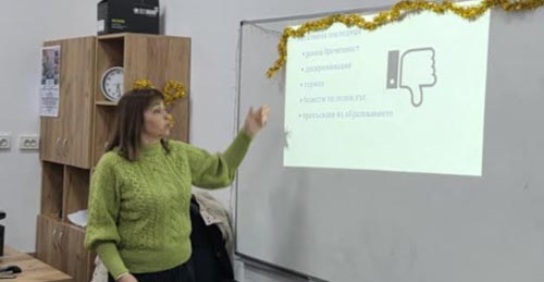 Лекция на тема „Ранни бракове“ сред учениците от 8 и 9 клас на Професионална гимназия по транспорт изнесе г-жа Радостина Пашова, Директор на Дирекция „Социално подпомагане“ Крумовград и член на Местната комисия за борба срещу противообществените прояви на малолетни и непълнолетни при Община Крумовград. Младежите имаха възможност да се запознаят с основните проблеми, които пораждат ранните съжителства, нормативната база, регламентираща подкрепата и съдействието на институциите, както и необходимостта от превантивна работа в тази посока.