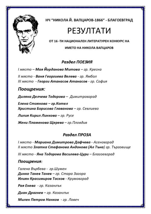 XVI Национален конкурс на името на Никола Вапцаров, посветен на гражданската тематика в поезията и прозата, събра тази година над 400