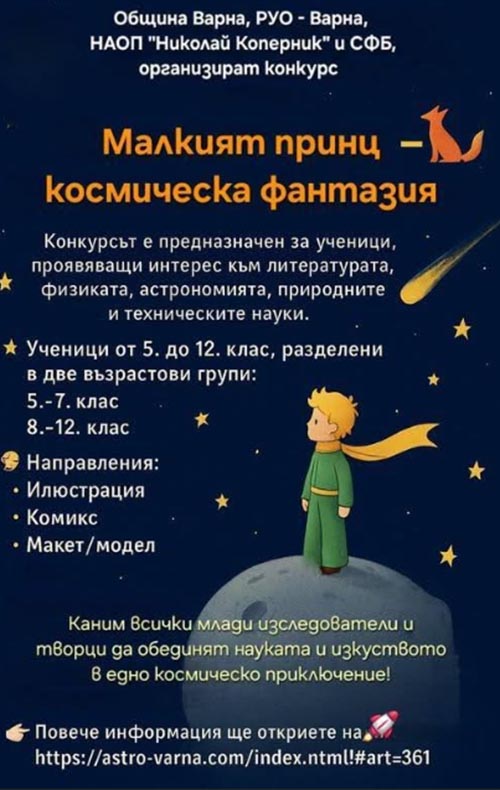 Инициативата се организира от Община Варна, Астрономическата обсерватория с планетариум „Николай Коперник“ – Варн, и Съюза на физиците в България. Посветена е на 125-годишнината от рождението на Антоан дьо Сент-Екзюпери. Конкурсът обединява света на Космоса и философията на „Малкият принц“ с въображението на учениците. Той насърчава любознателността, творческото мислене на младите хора .