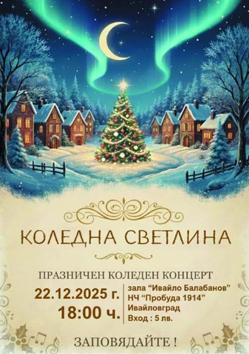 Вълшебна вечер, изпълнена с музика, танц и коледно настроение, обещава Община Ивайловград на своите жители и гости. На 22 декември от 18 ч. зала „Ивайло Балабанов“ в НЧ “Пробуда 1914“ в Ивайловград очаква зрителите.