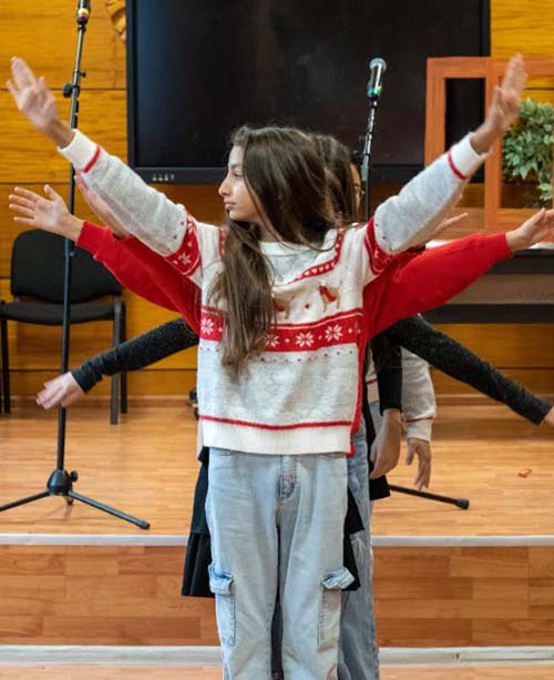 Водещите Рая и Атанас представиха първо коледния танц на малките мажоретки от танцов състав „Мистерия“ с ръководители Тонка Димитрова и Весела Василева. След тях петокласничката Селда Манолова направи своя дебют на сцена със стихотворение за Дядо Коледа. Семих от 4″в“ изпълни коледна песен с подкрепата на танцуващите си съученички, а самодейни състави от 4″е“, 5″б“ и 6″б“ изтанцуваха свои композиции по коледни класики.
