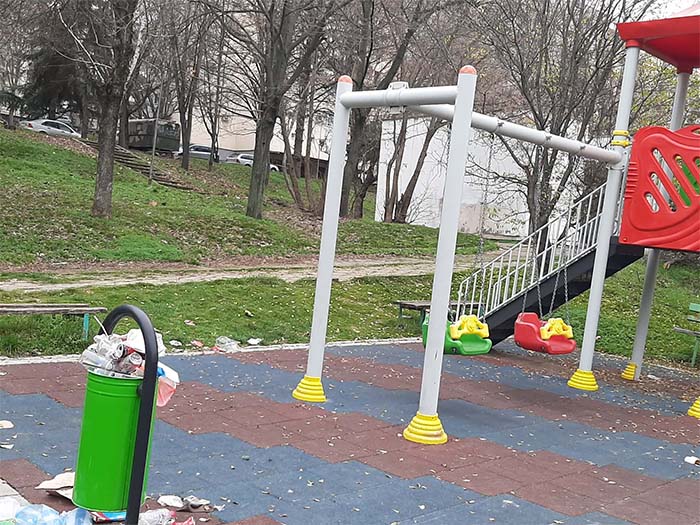От дни детската площадка до 33-ти блок в квартал „Възрожденци“ в Кърджали е потънала в мръсотия. Кошчетата са препълнени.