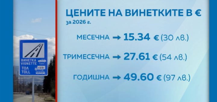 От 3-ти февруари въвеждат еднодневна винетка за пътищата в страната. Тя ще бъде на стойност 4 евро и 9 цента и ще важи за 24 часа. Ясни са и цените на останалите винетки, но в евро, като те остават непроменени спрямо миналогодишните, съобщи бТВ.