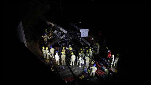 Две денонощия след фаталната катастрофа между два влака по линията Севиля-Мадрид, работата на пожарникарите продължава. Кранове разчистват мястото на инцидента, за да могат екипите да достигнат до смазаните вагони.
