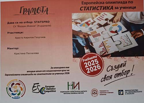 Христо Георгиев от 8.б клас на СУ „Йордан Йовков“ се класира за втория кръг на Европейската олимпиада по статистика за учебната 2025/2026 година, което е първо участие на училището в тази престижна международна надпревара.