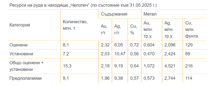 По-долу следва оценката на ресурсите на руда по състояние към 31.05.2025 г. след приспадане на запасите.