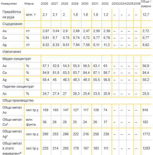 В таблицата по-долу е представена текущата оперативна прогноза за добив и първична преработка на руда от находището на база актуалната оценка на запасите на руда. След тестване на различни варианти, избраният от тях най-пълно отговаря на целите на производството и оптимизира нетната стойност на активите при поддържане на средногодишна производителност от 2,2 млн. т руда до 2032 г. вкл., след оптимизация спрямо степента на разкриване на запасите.