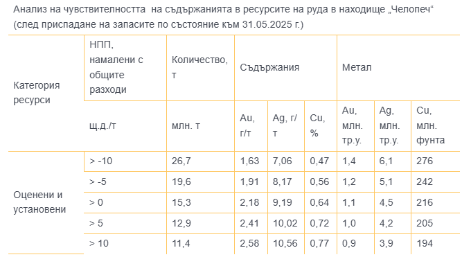 - Откритие с атрактивен потенциал в участък „Клиновидна зона”: Оценката на ресурсите и запасите на находището не включва наскоро направеното откритие в дълбоката част на участък „Клиновидна зона”, разположен в северния фланг на концесионна площ „Челопеч“, на около 300 м под текущия контур на ресурсите и запасите и съществуващата руднична инфраструктура, както и находище „Челопеч-север“ и площ „Брѐвене“. Актуална информация за хода на сондажните работи в участък „Клиновидна зона“ се очаква през второто тримесечие на 2026 г.