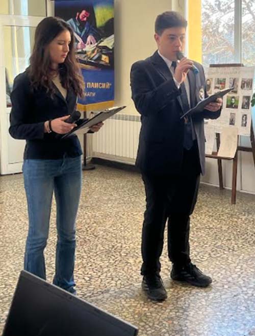 Водещи на програмата бяха Георги Димитров и Виктория Стойкова от 11.а клас, които откриха събитието със стихотворението „Опълченците на Шипка“ по стихове на Вазов. Те представиха богатото съдържание на празника, преплетено с исторически препратки и вълнуващи изпълнения: