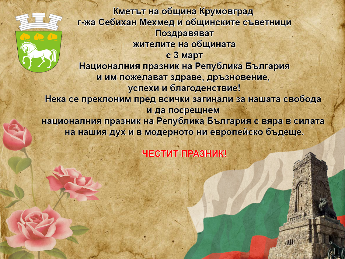 Себихан Мехмед: Честит празник! Пожелавам на всички здраве, дръзновение и благоденствие! от Денис Делев · Акценти / Крумовград / Новини / Общество / РЕГИОН · 10:30 / 03.03.2026 Споделяне Share on Facebook (Opens in new window) Facebook Share on X (Opens in new window) X Email a link to a friend (Opens in new window) Email
