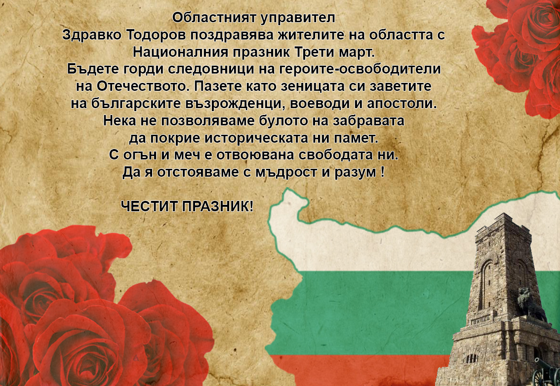 Здравко Тодоров: Честит 3-ти март! Бъдете горди следовници на героите-освободители на Отечеството от Денис Делев · Акценти / Новини / Общество / РЕГИОН · 09:00 / 03.03.2026 Споделяне Click to share on Facebook (Opens in new window) Facebook Click to share on X (Opens in new window) X Click to email a link to a friend (Opens in new window) Email