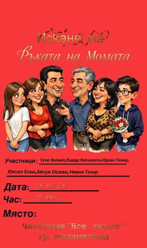 Възстановка на традиционния обичай „Искане на ръка на мома“ ще бъде представена на 26 март (четвъртък) от 18.00 часа в читалище „Нов живот“ в Момчилград. Събитието е част от програмата на Младежкия фестивал, който събира млади хора около традициите, изкуството и културата.