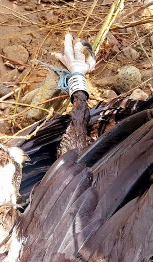 - При огледа е установено, че на единия крак на лешояда има усукано синтетично влакно, към което е завързан камък