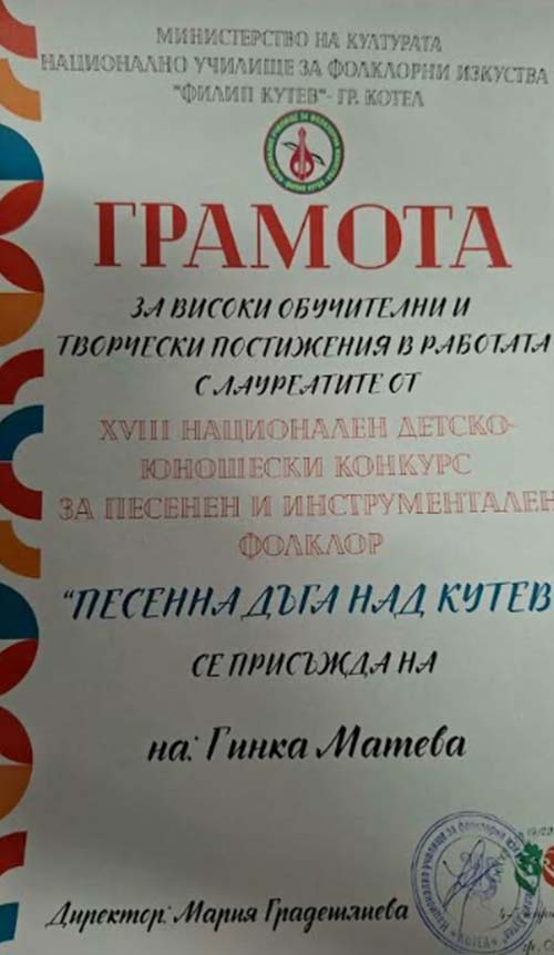 Съществен принос за постигнатите успехи има ръководителят на младите таланти Гинка Матева, която бе удостоена с грамота за високи обучителни и творчески постижения.