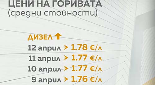 Средната цена на дизеловото гориво в страната достигна 1.78 евро за литър, сочат данните на Националната агенция за приходите към 12 април. Отчита се последователно повишение, като в рамките на три дни цената е нараснала с 2 евроцента – от 1.76 евро на 9 април до настоящите нива.