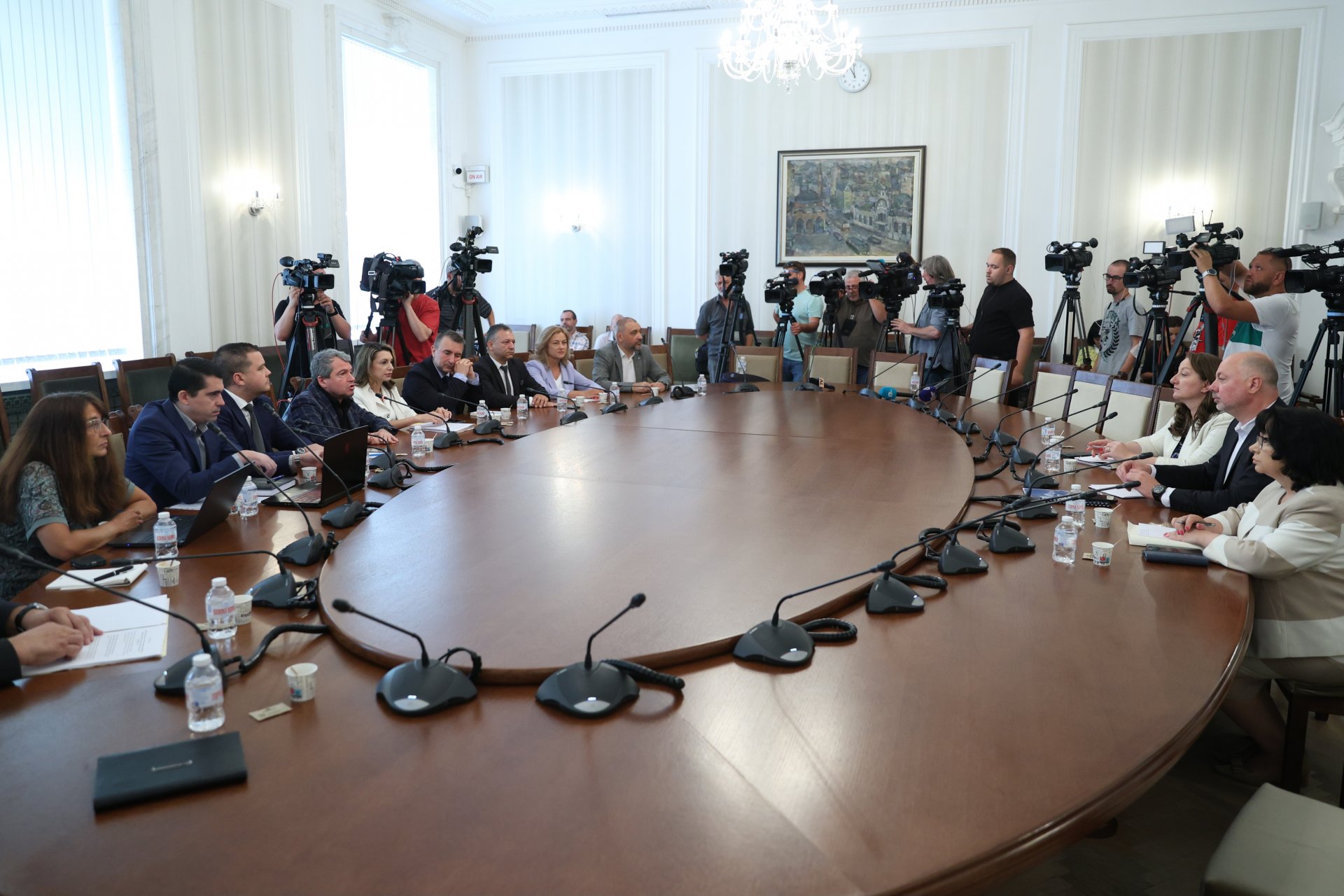 В днешната среща в сградата на бившия Партиен дом участваха Деница Сачева, Теменужка Петрова и Росен Желязков от страна на ГЕРБ-СДС, а партията на Слави Трифонов бе представена от Тошко Йорданов, Станислав Балабанов, Ивайло Вълчев, Андрей Чорбанов и експерти.
